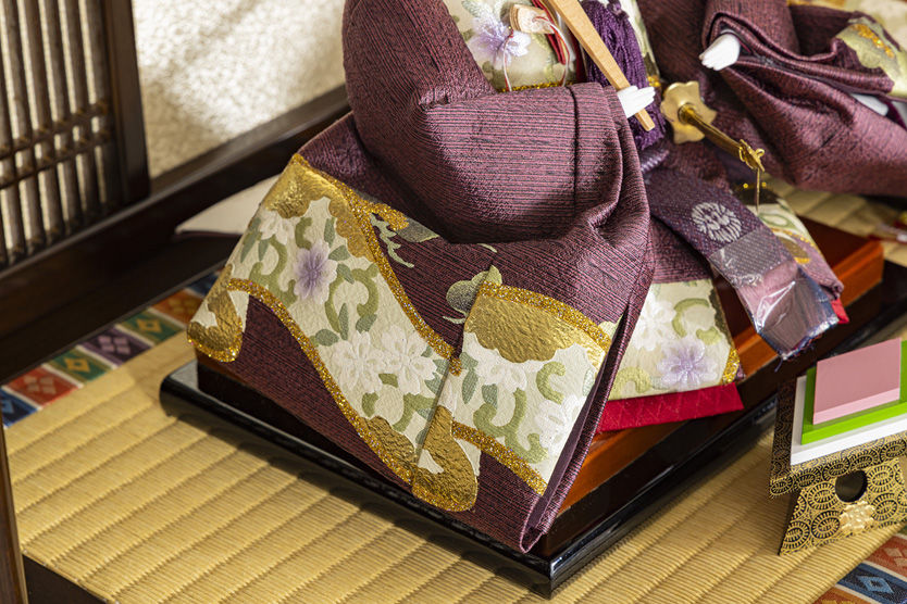 金彩衣装を纏った伝統的な三段飾りです。絢爛豪華な雰囲気を演出します。(本店店長)