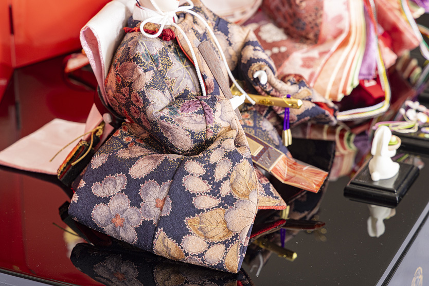 辻が花のお着物と会津塗収納箱を合わせました。上品で可憐な印象を放ちます。(節句アドバイザー:鮫島)