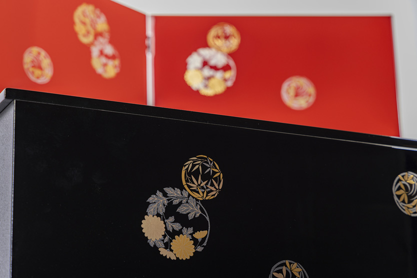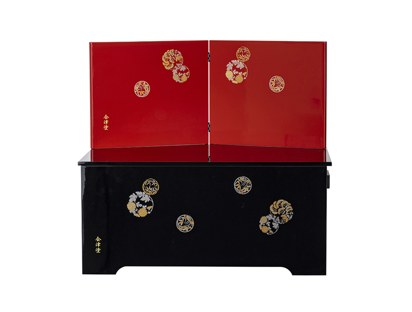 会津塗の収納箱(間口60cm)は毎年人気です。赤と黒のコントラストがとても美しい仕上がりです。