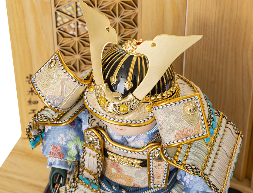 中国三大刺繍の一つ、汕頭(すわとう)刺繍をあしらった子供大将です。毎年人気の五月人形として親しまれています。(節句アドバイザー:川瀬)