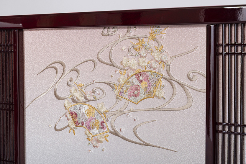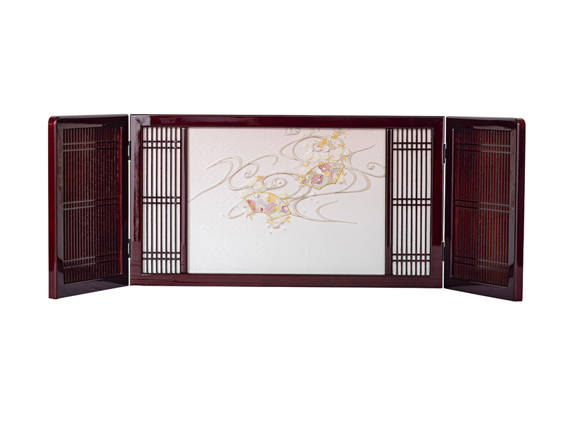 ワイン色に塗られた台と屏風は上品な仕上がりです。ぜひ間近でご覧ください。