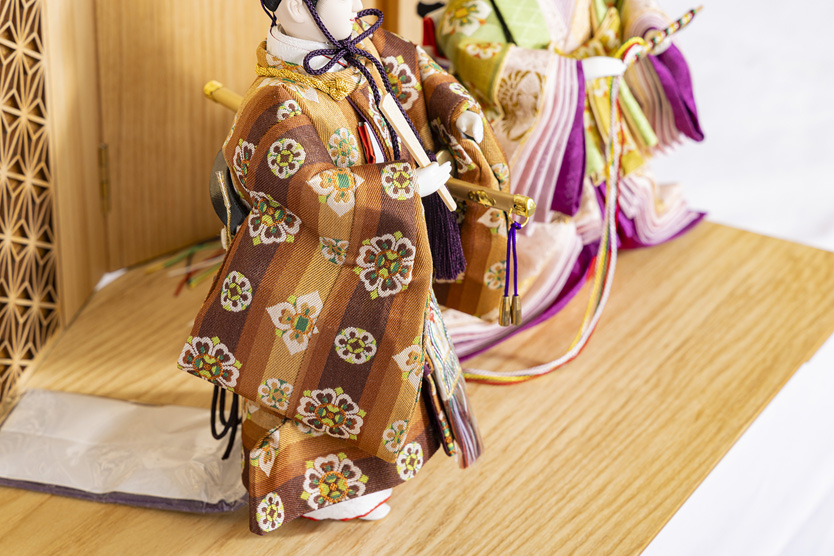 「天平木画奏花錦」を着物に採用し、コンパクトながら気品高く華麗に演出しました。2026年限定製作です。(節句アドバイザー:川瀬)