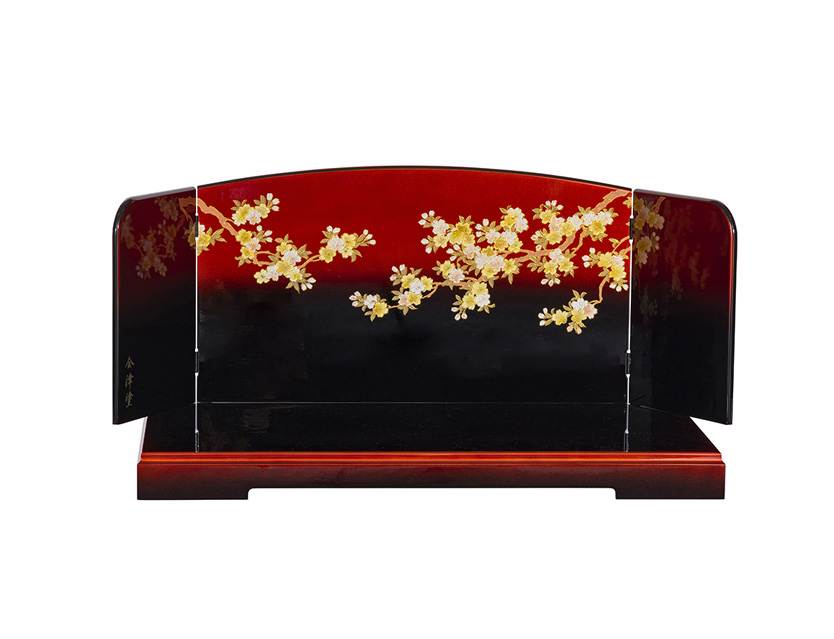 会津塗の飾り台に、金糸を纏う辻が花のお雛様を飾りました。圧巻の美しさです。(節句アドバイザー:鮫島)