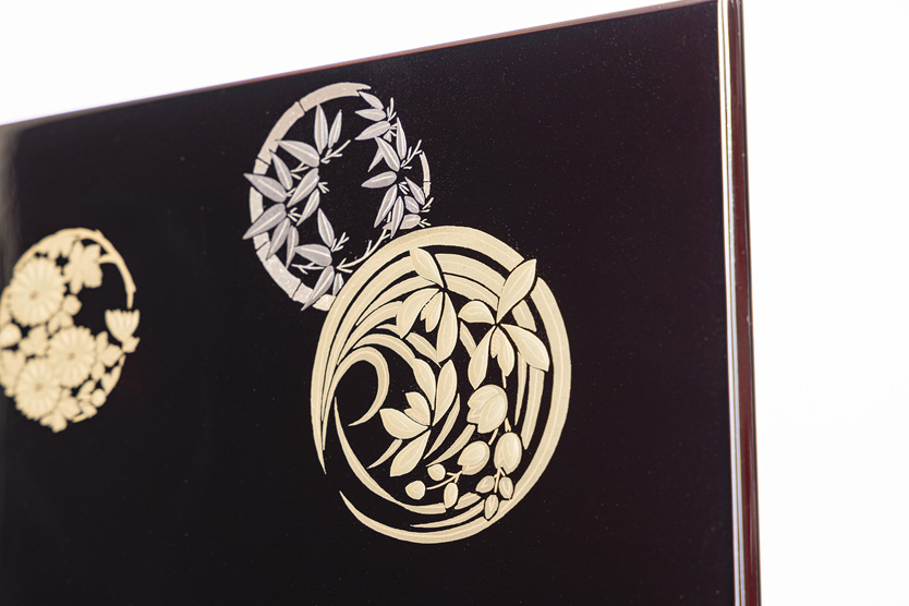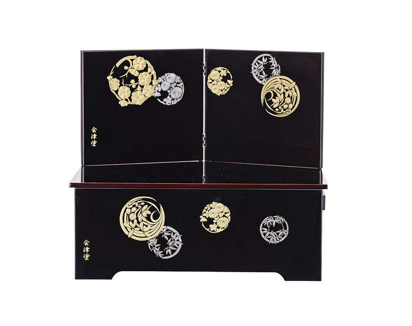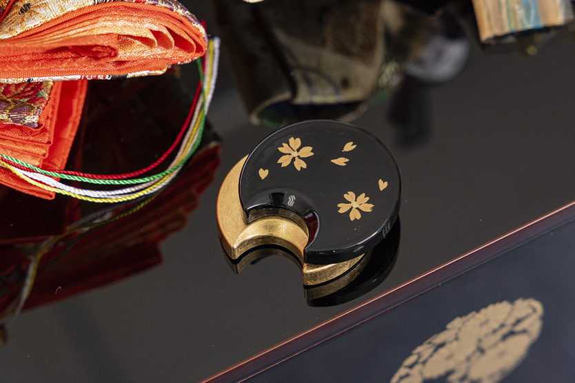 吉浜人形特注の収納箱は会津塗職人の技が光ります。三日月と名付けた小物も金と黒で上品に仕上げました。