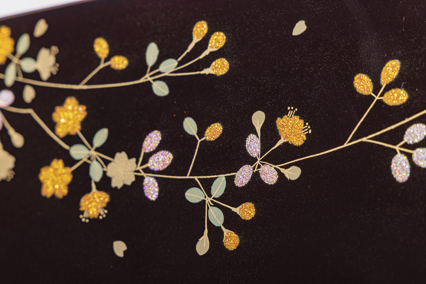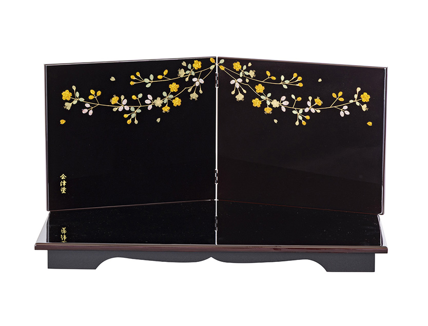 おぼこ人形と塗物の台屏風を組み合わせました。重厚感と可愛らしさに思わず見惚れます。(節句アドバイザー:金森)