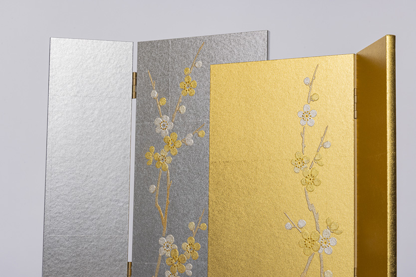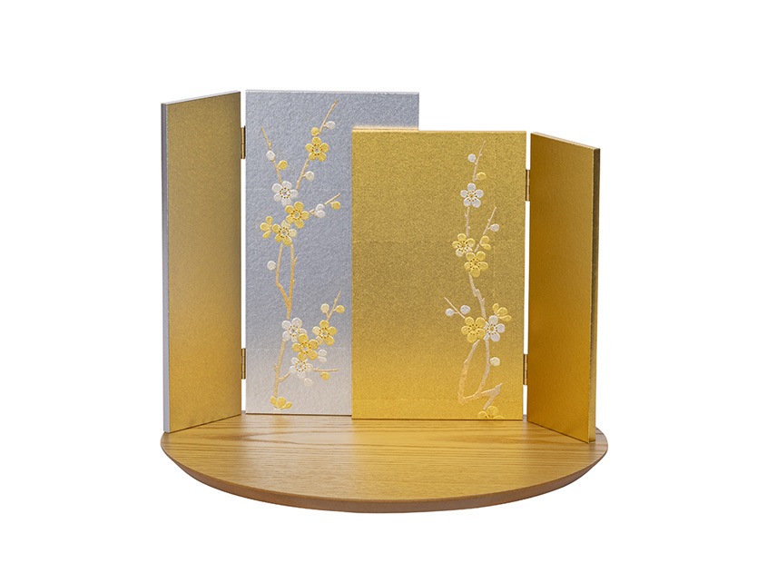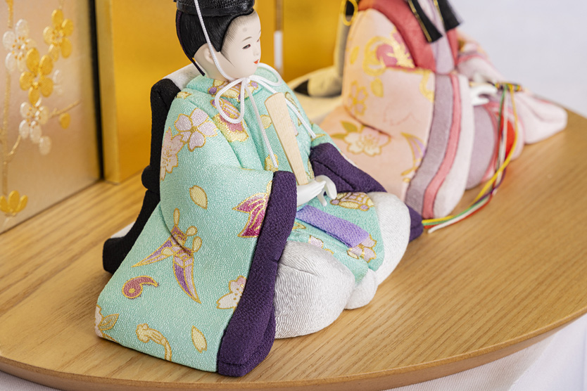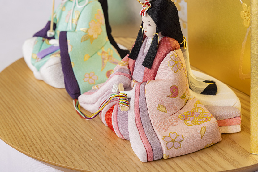 皇后様のご養蚕に由来する小石丸を用い、宝尽くしの新作を制作しました。金銀屏風と合わせて上品に仕上げています。(節句アドバイザー:川瀬)
