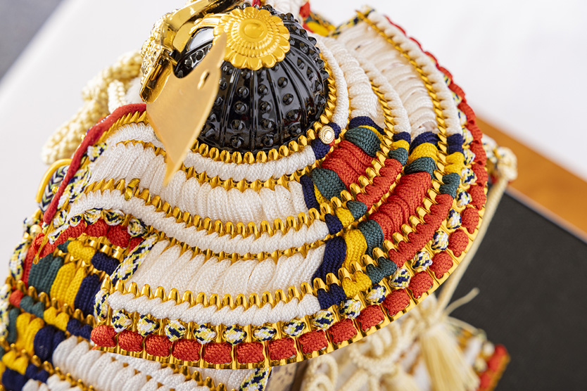 白糸褄取(つまりどり)の兜です。褄取とは鎧や兜の裾の下を三角形に区切り、別の色糸で綴じ合わせる技法のことで、とても高度な技術を必要とします。匠の技が光る逸品です。