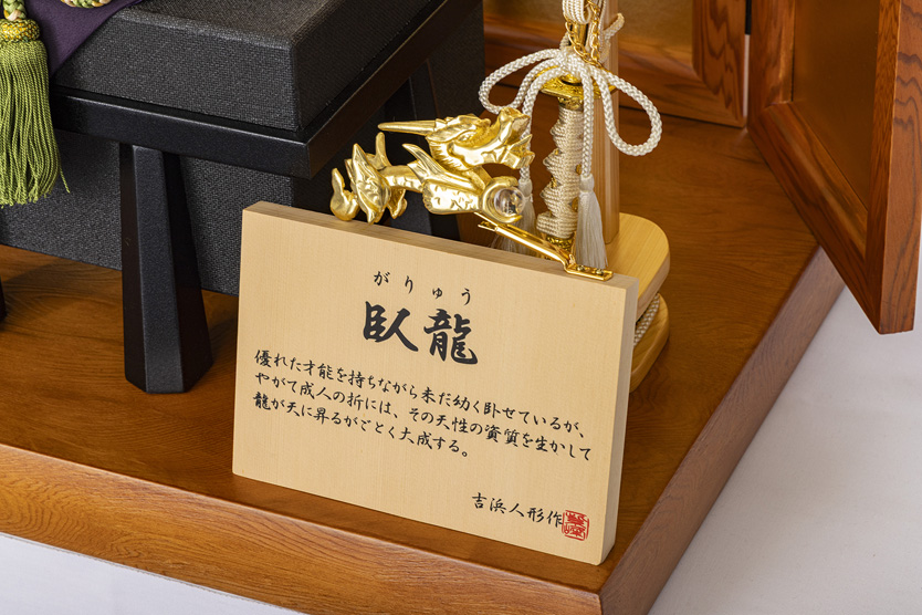 定番人気の屋久杉台屏風です。兜にはお好きな一文字をお入れすることができます。兜の龍頭を取り文字プレートを装着する事ができます。(節句アドバイザー:川瀬)