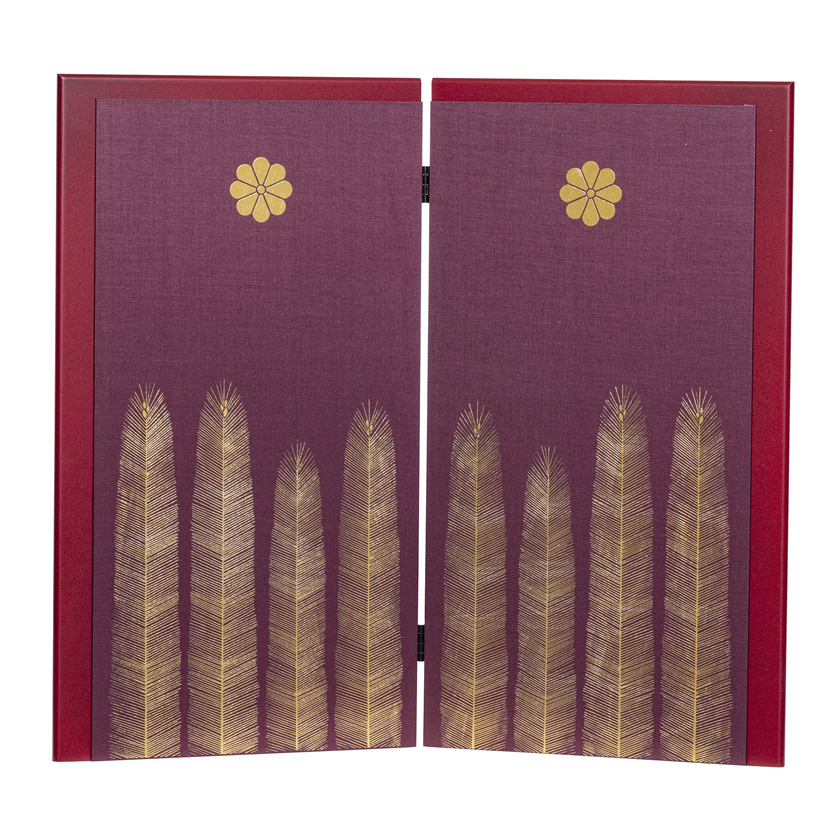 「宮殿松の間」の雰囲気を台と屏風で表現しました。松の間で行われる大切な行事になぞらえ、お子様の誕生と健やかな成長への願いを込めています。