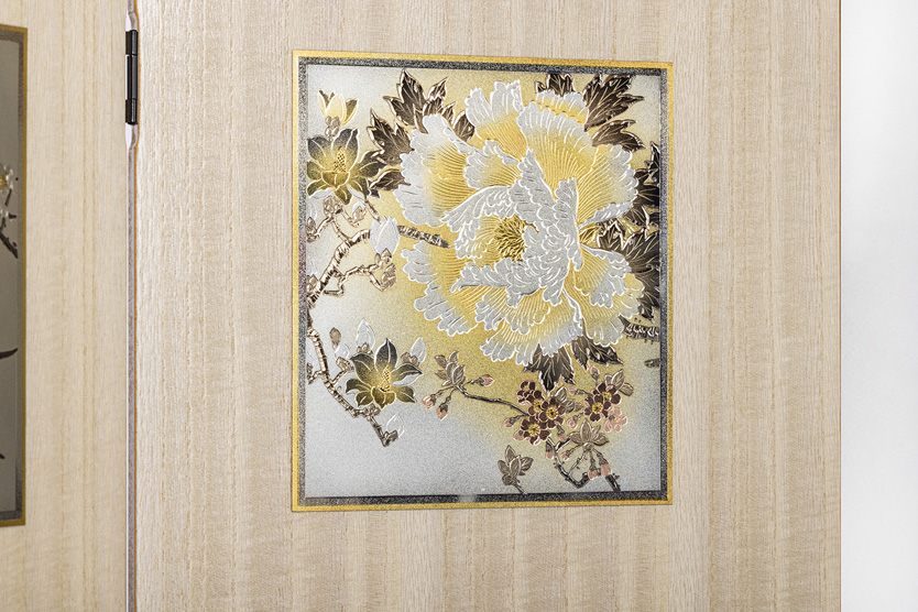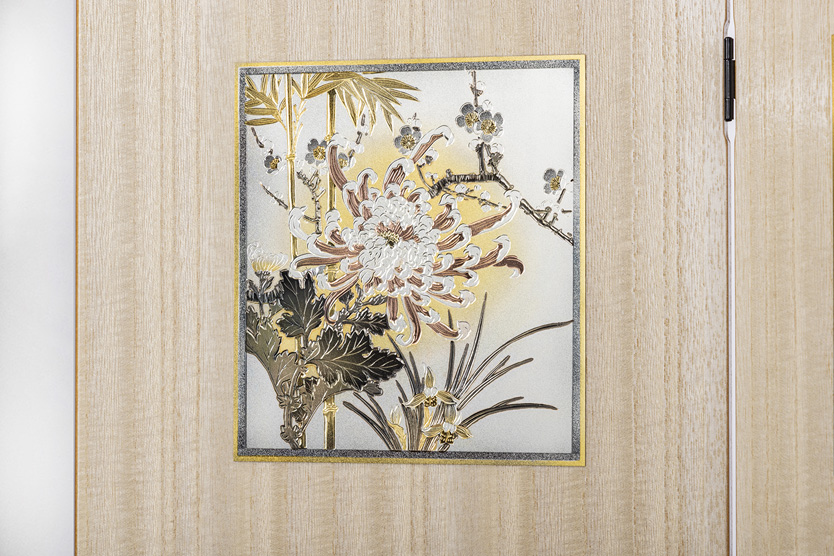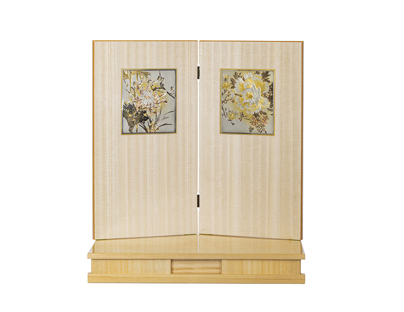 四君子(蘭・竹・菊・梅の4種)は、学識が高く礼儀を備えた聖人君子の姿を象徴します。そのように健やかに成長してほしいという願いを込めた屏風です。