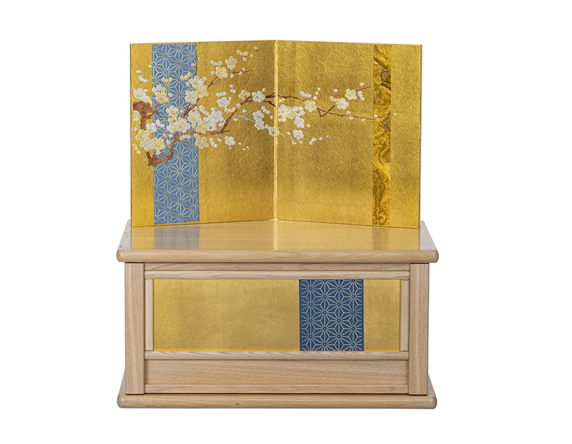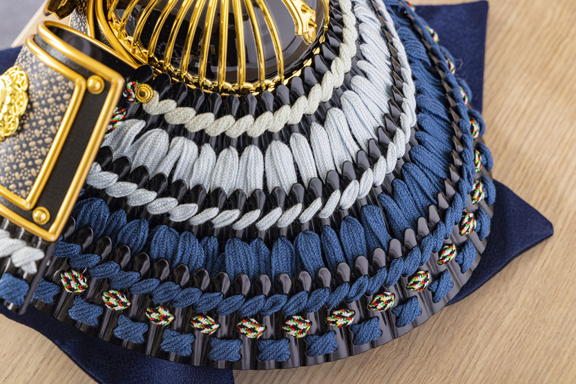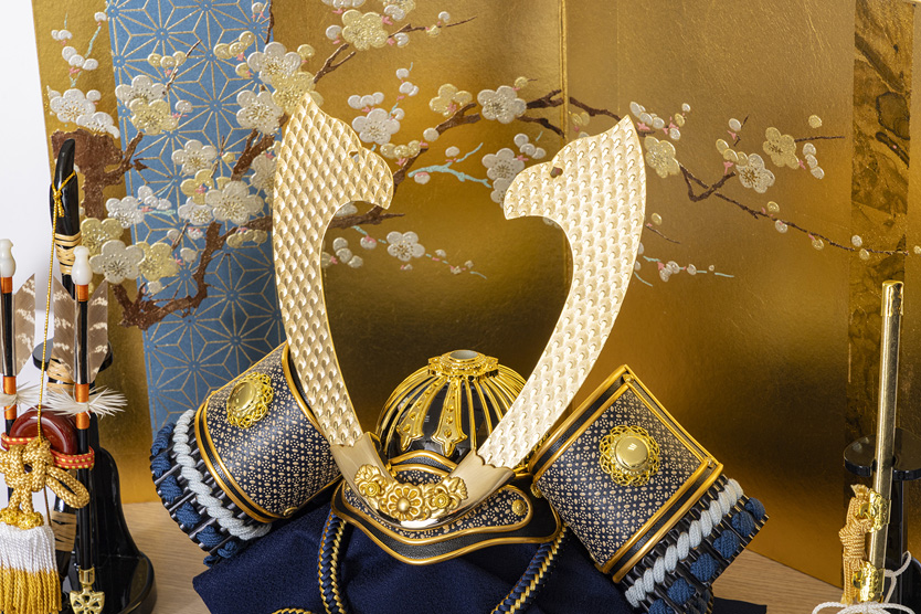 ナチュラル木目と金の兜に、麻の葉模様の紺色を合わせた配色が魅力を引き立てます。(節句アドバイザー:浅岡)